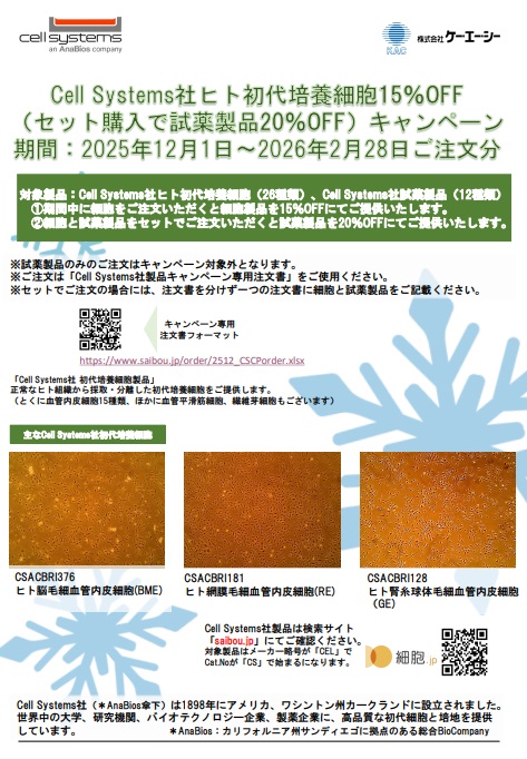 Cell Systems社ヒト初代培養細胞15%OFF (セット購入で試薬製品20%OFF)キャンペーン